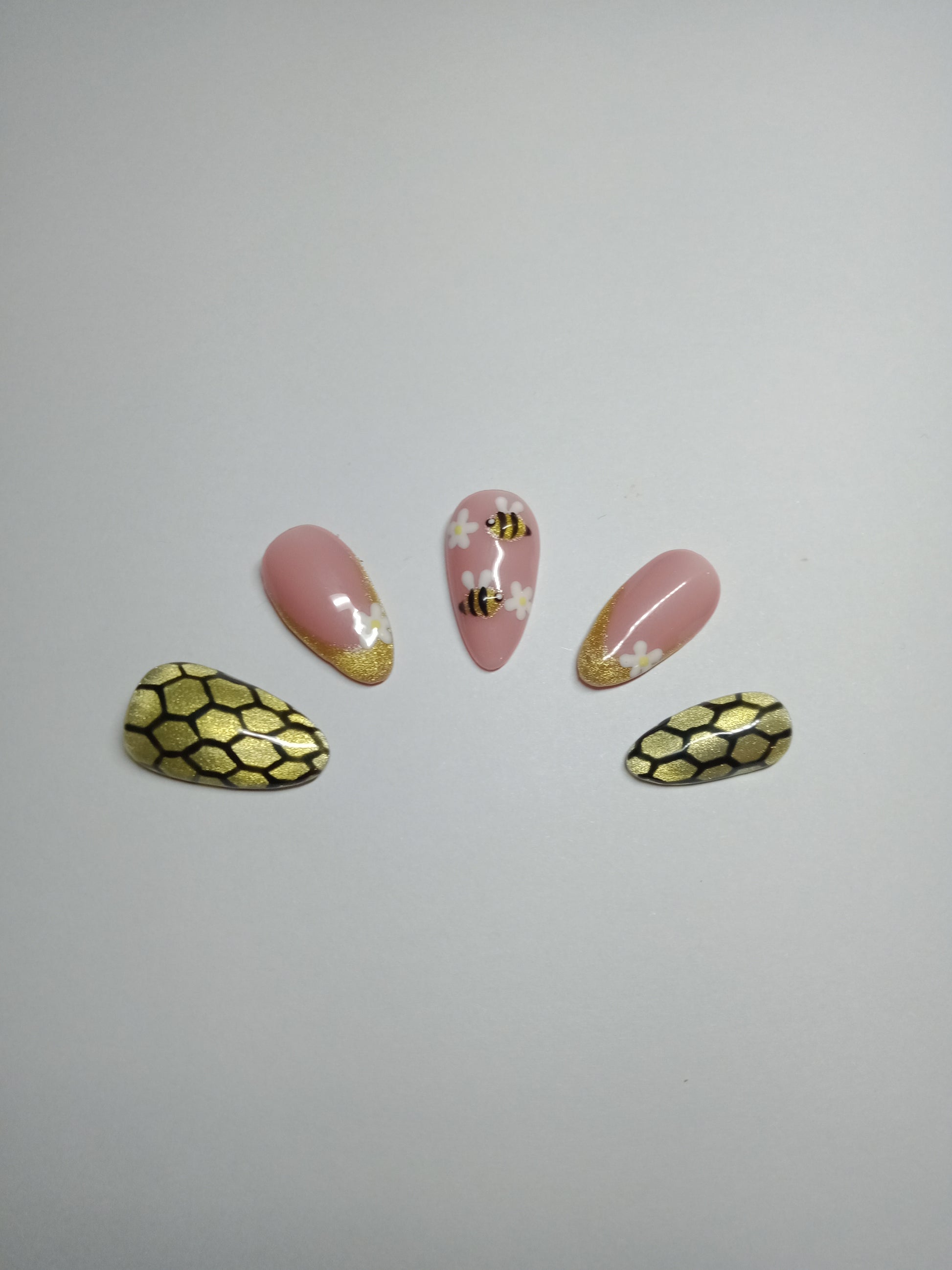 Bee's Bliss is a nude with yellow cat eye French tip, yellow cat eye with black lining honeycomb, white flowers and cat eye bees.