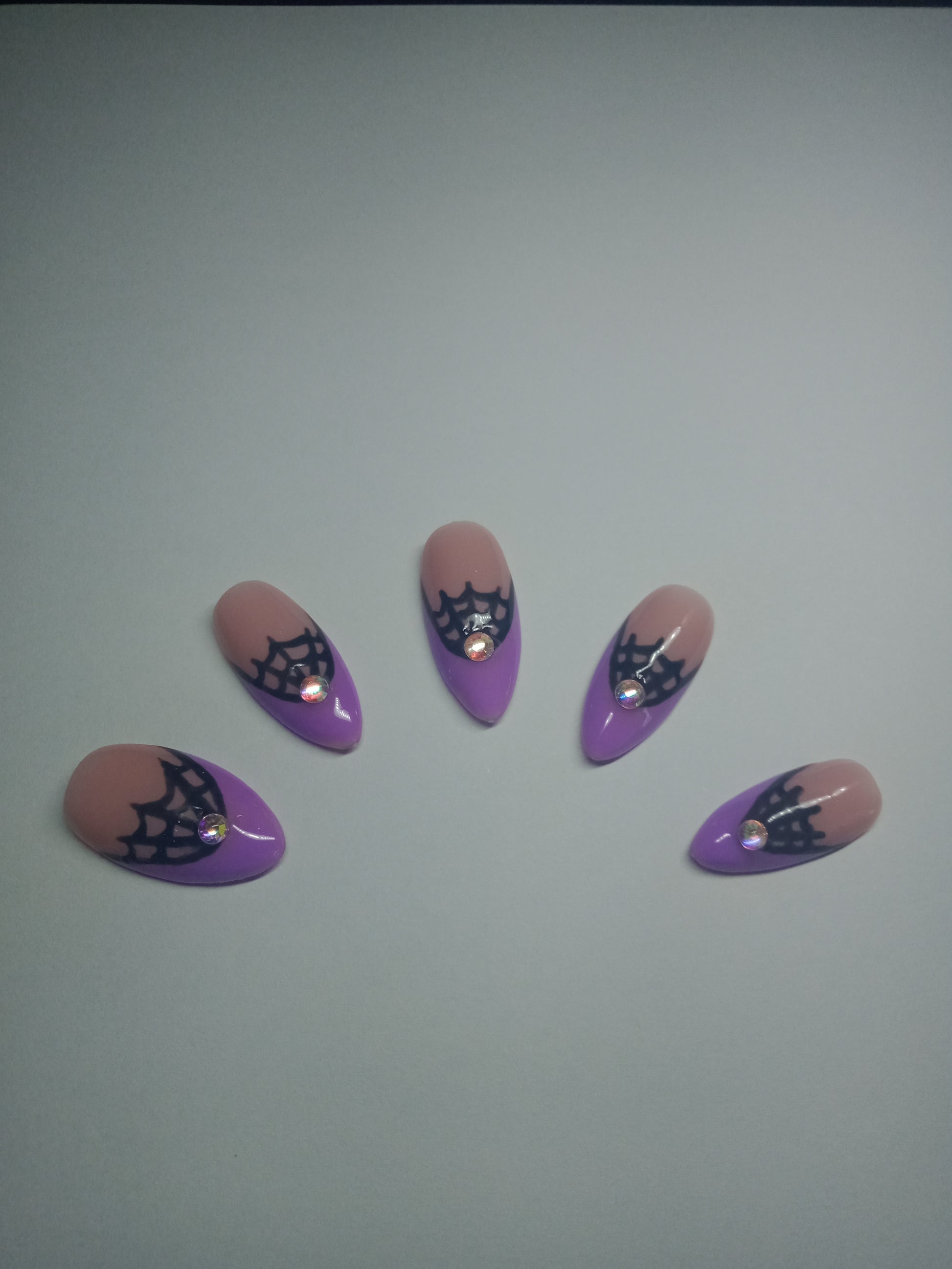 Caught In A Web is a nude base with purple French tip, black webbing above the French tip and a gem to meet in the middle.