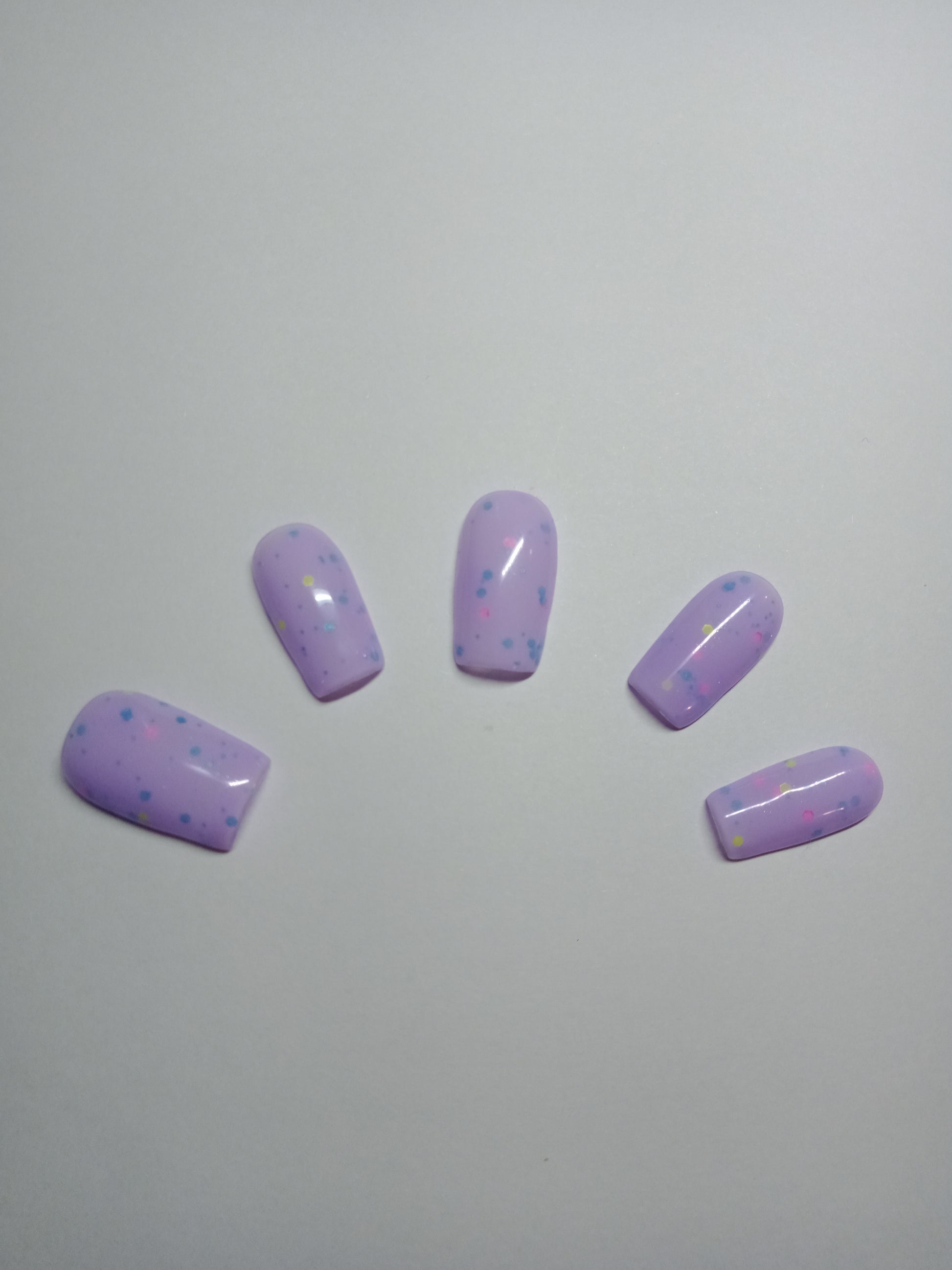 Confetti is a light purple base with pink, blue and yellow specks.