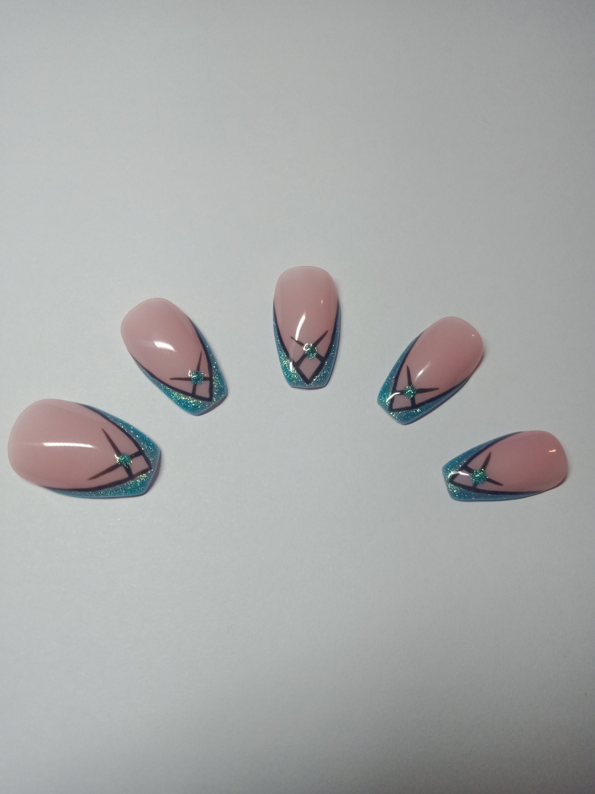 Enchanted Ivy is a nude base with a fancy green and blue French design with black line detailing.