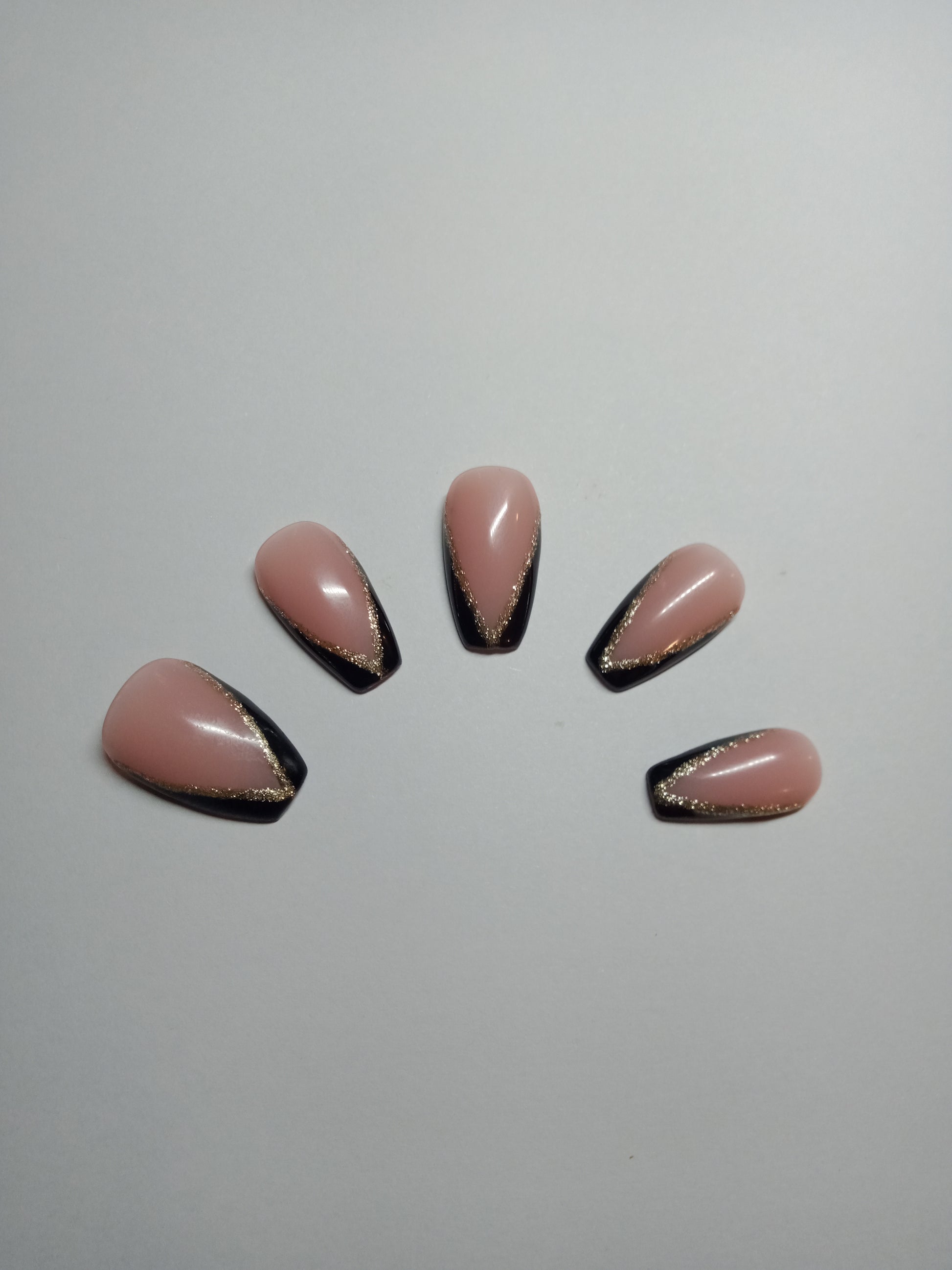 French Twist is a little different to your classic French but instead of white tip it has a black deep v tip with gold glitter lining for a dark classy look.