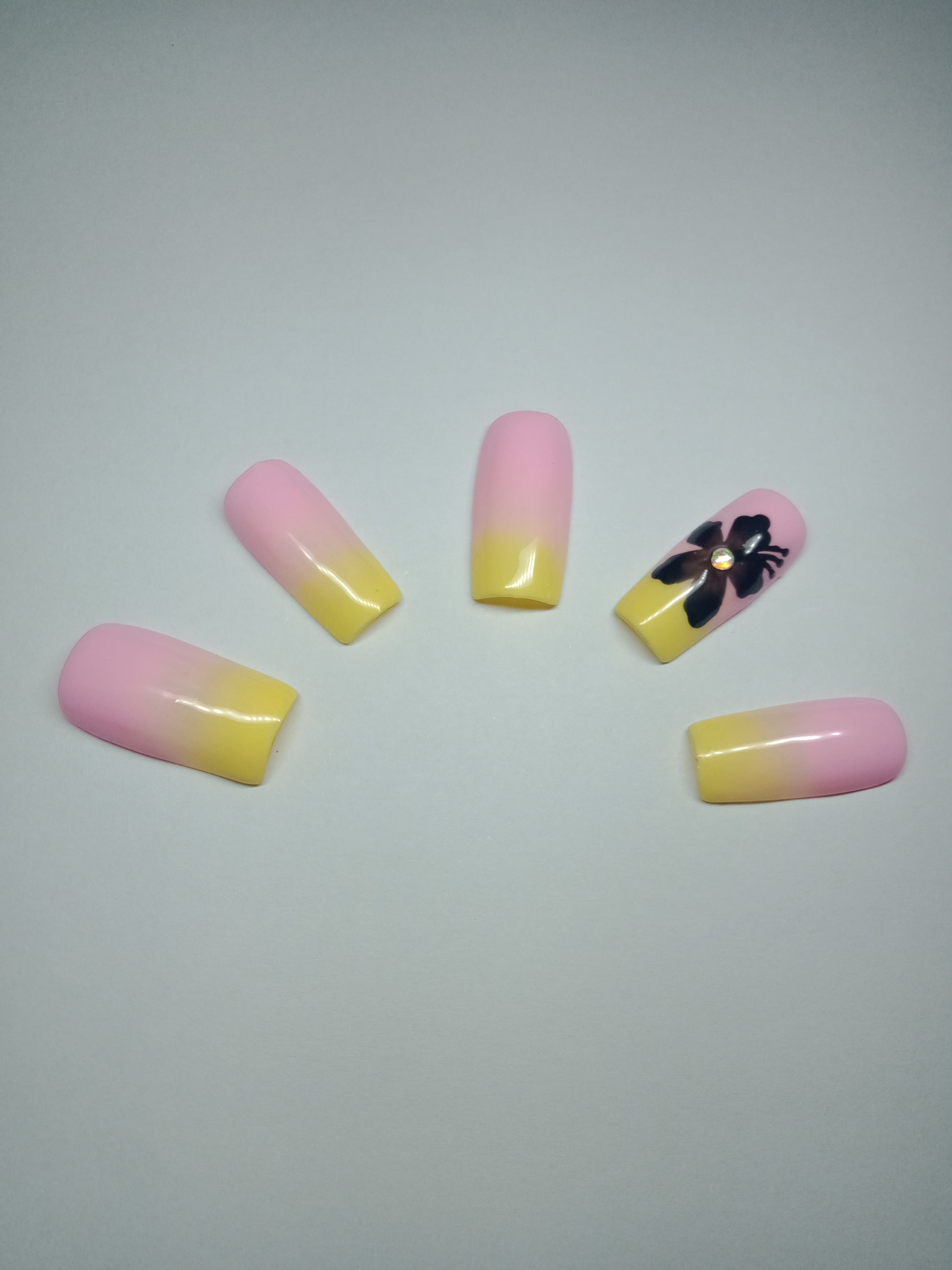 Summer Tropic is a pink and yellow ombre with a black flower on the ring finger and a gem in the middle.
